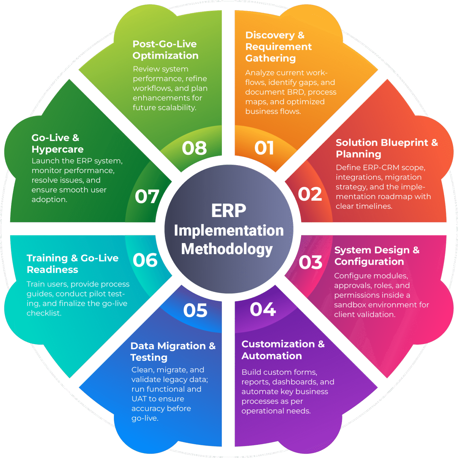 A structured, proven approach that ensures seamless ERP and CRM deployment with zero business disruption.